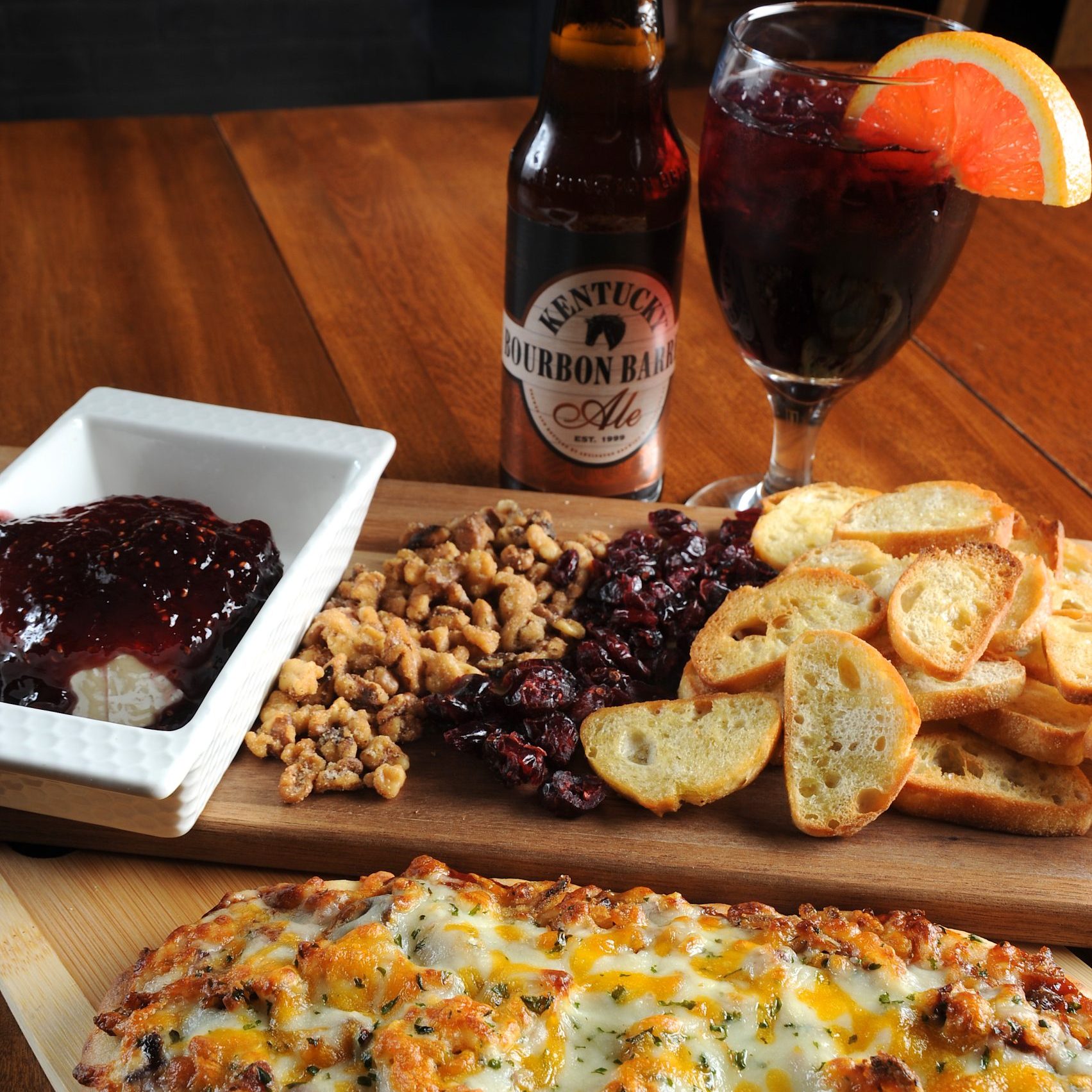 Our baked brie is topped with raspberry jam and served with crackers, frosted walnuts, and craisins.