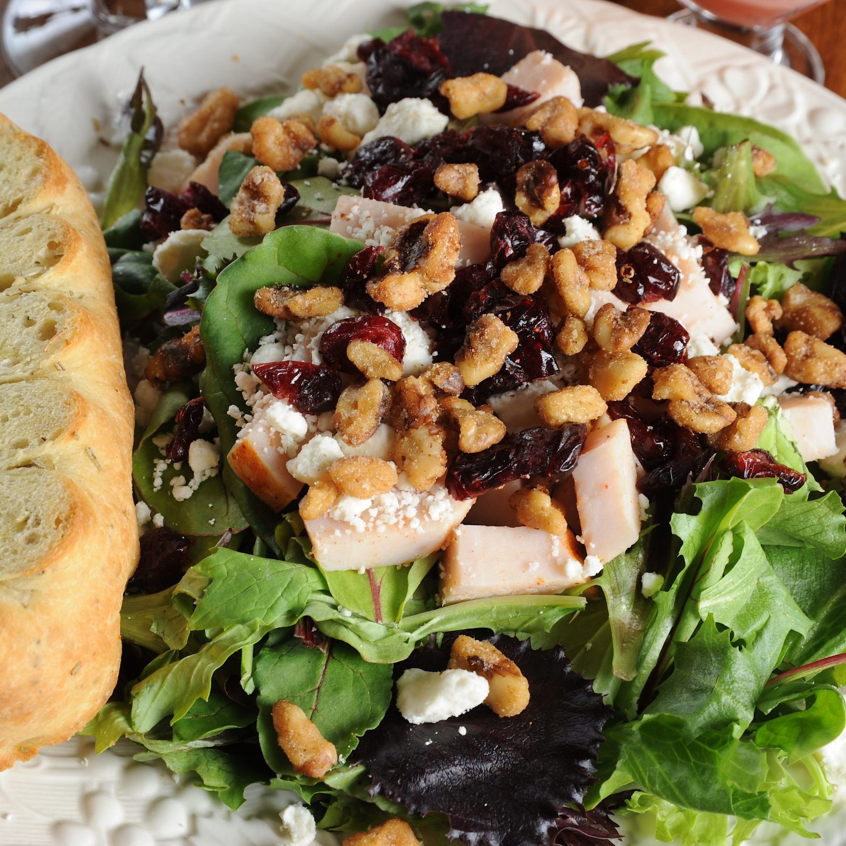 Hand-Carved Oven-Roasted Turkey on Romaine Lettuce with Feta Cheese, Craisins, and Frosted Walnuts. Served with Lite Raspberry Vinaigrette or Dressing of Choice.